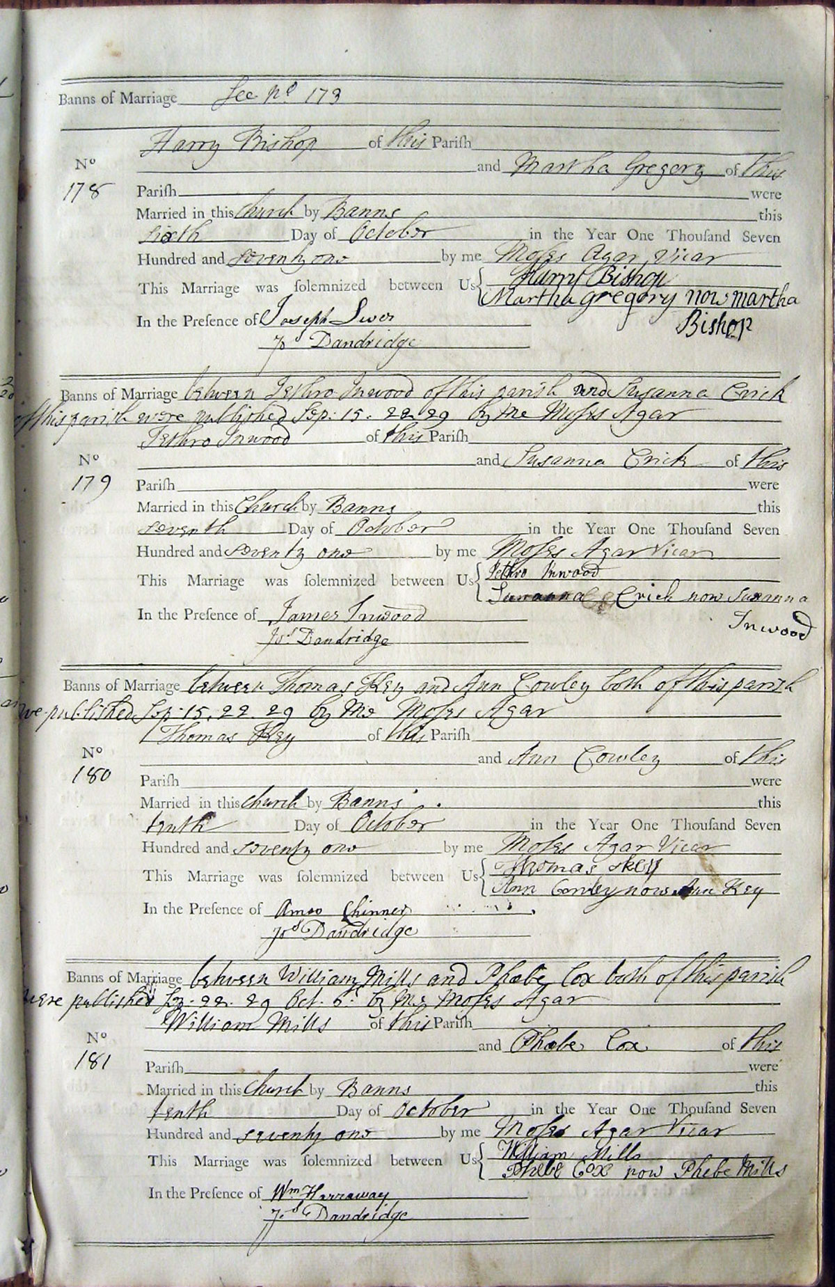 See banns entry 173; 2nd witness signed 'Jos.' |