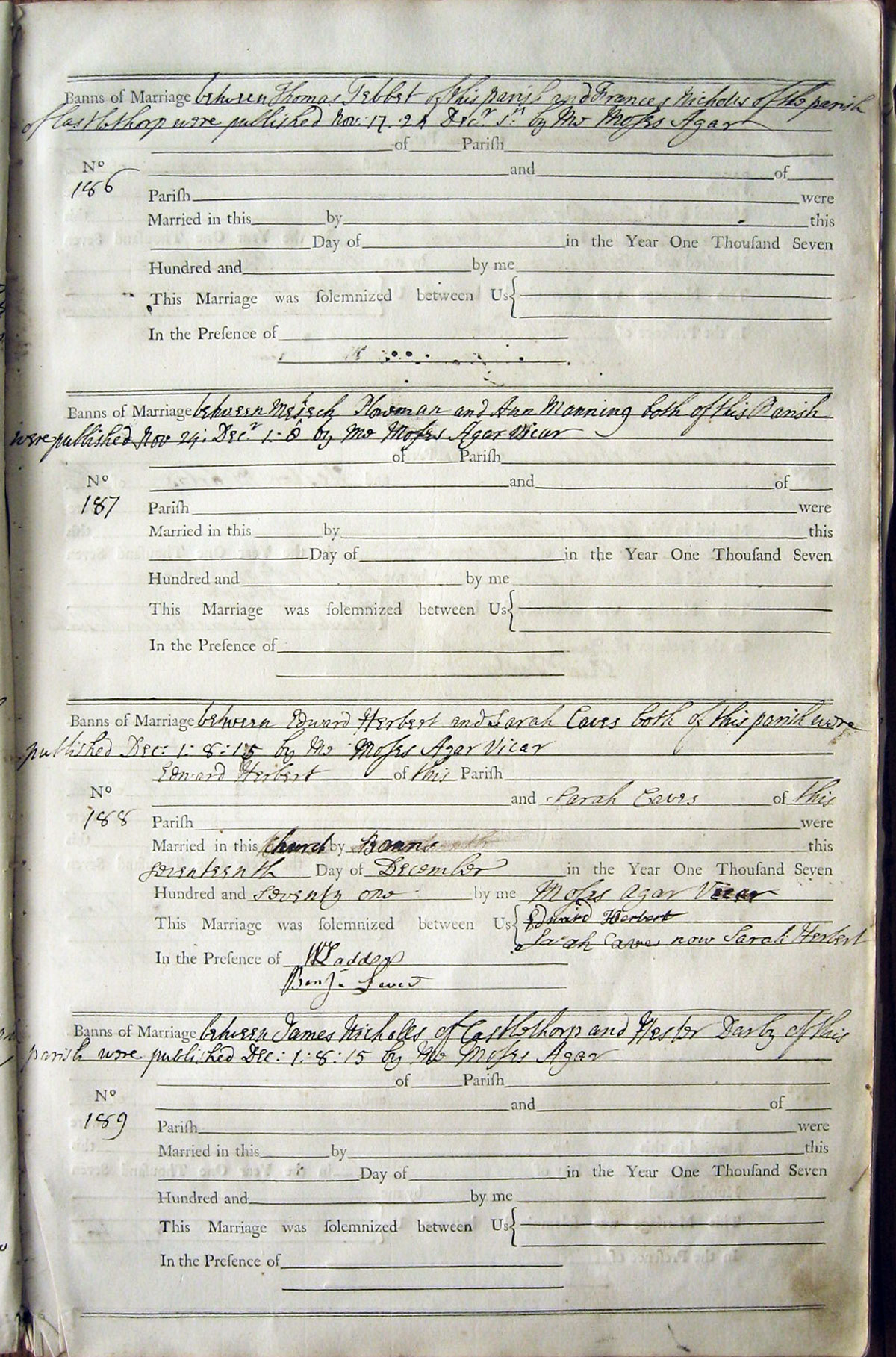 Banns of Marriage between Thomas Tebbet of the Parish of Hanslope, & Frances Nichols of the Parish of Castlethorp were published November 17, November 24, December 1, 1771 by me Moses Agar, Vicar