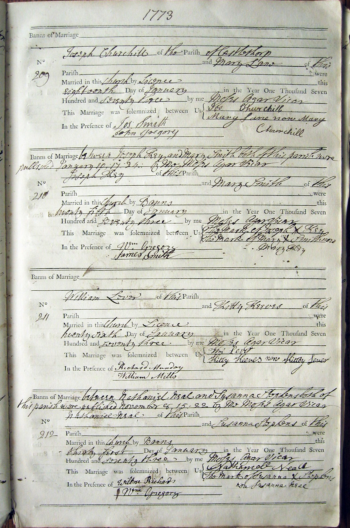 this marriage was solemnized between Us signed Joseph Churchill