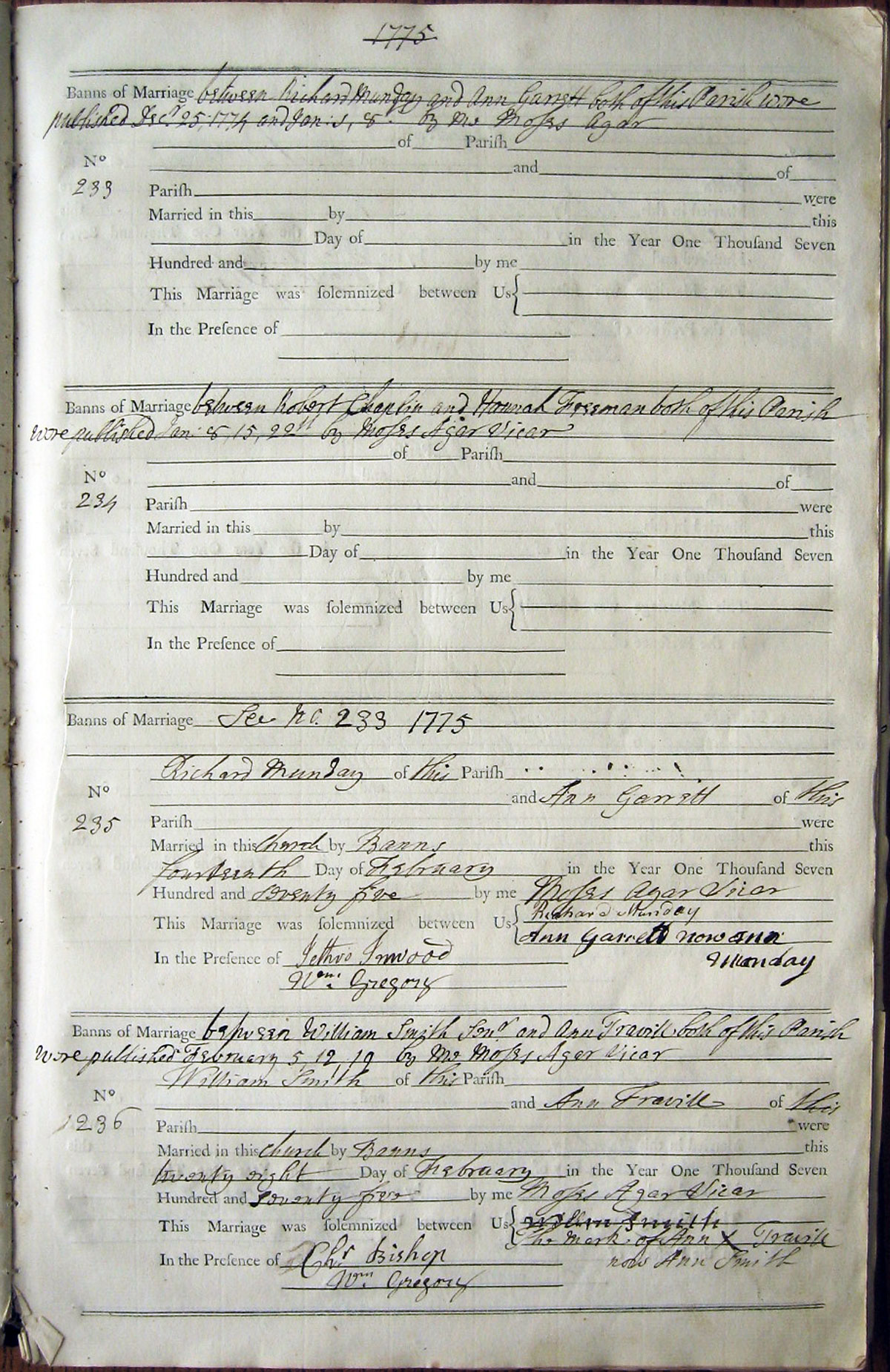 Banns of Marriage between Richard Munday of the Parish of Hanslope, & Ann Garratt of the Parish of Hanslope were published December 25, January 1, January 8, 1775 by me Moses Agar,