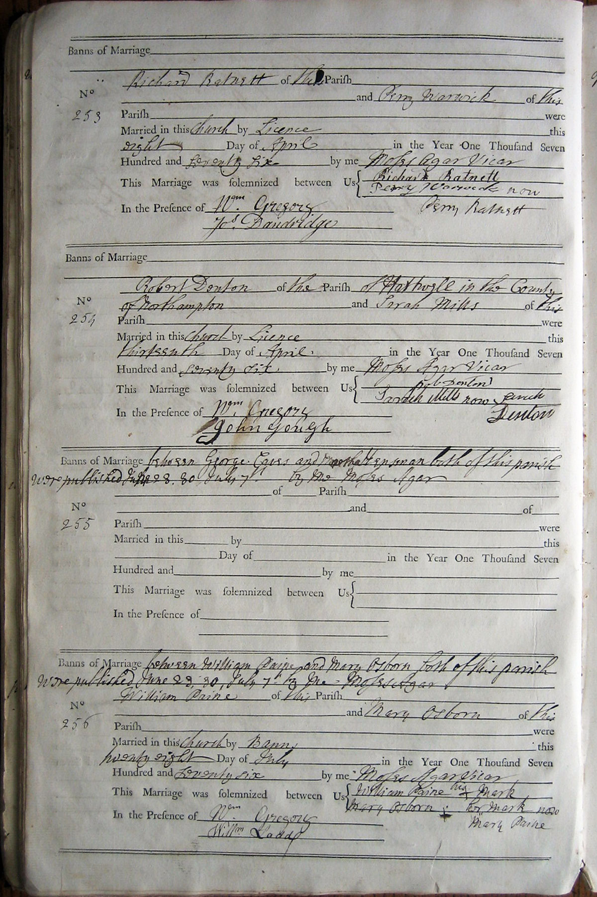Banns of Marriage between George Caves of the Parish of Hanslope, & Martha Henman of the Parish of Hanslope were published June 23, June 30, July 7, 1776 by me Moses Agar,