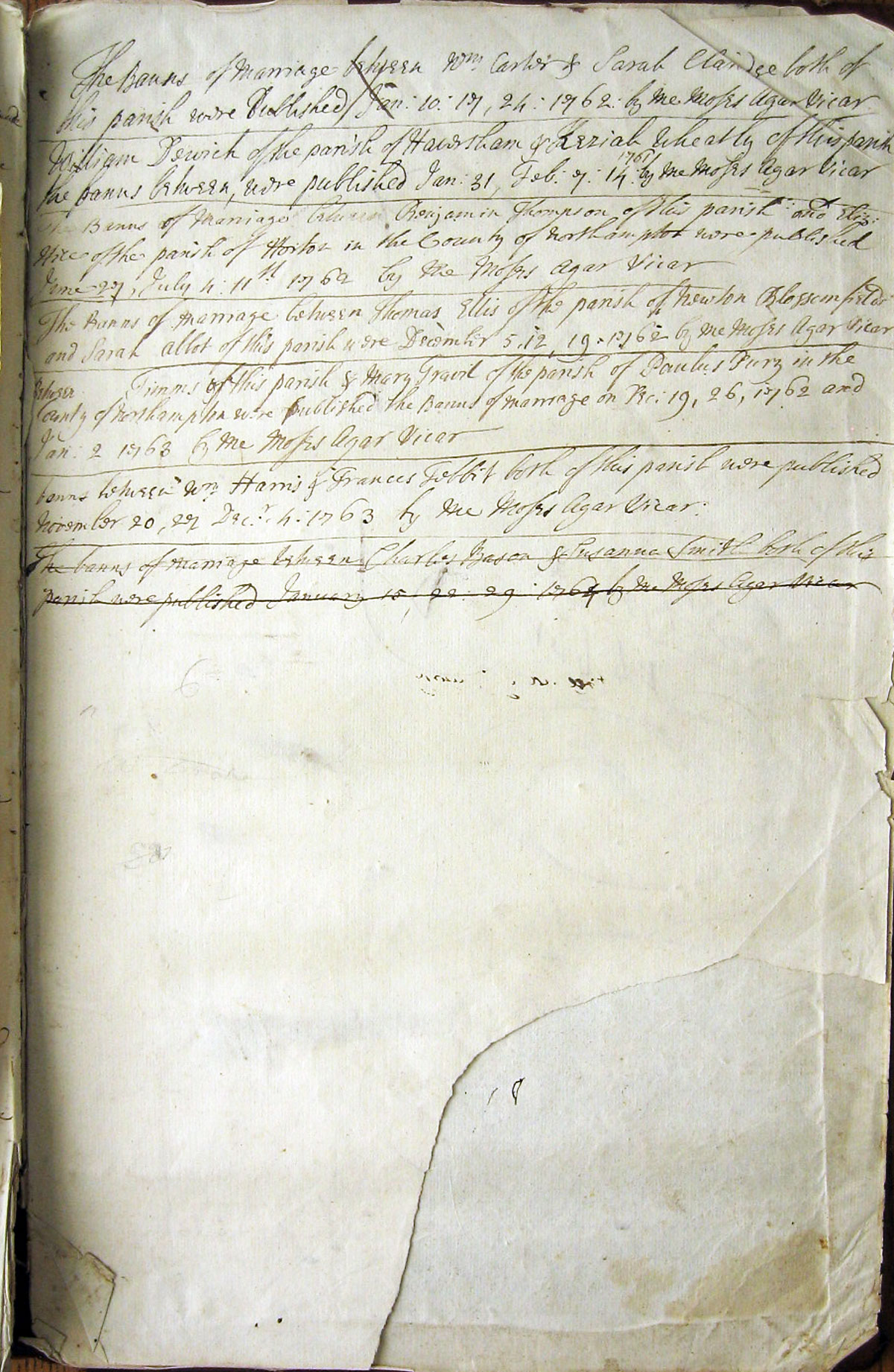 Banns of Marriage between William Carter of the Parish of Hanslope, & Sarah Claridge of the Parish of Hanslope were published January 10, January 17, January 24, 1762 by me Moses Agar, Vicar