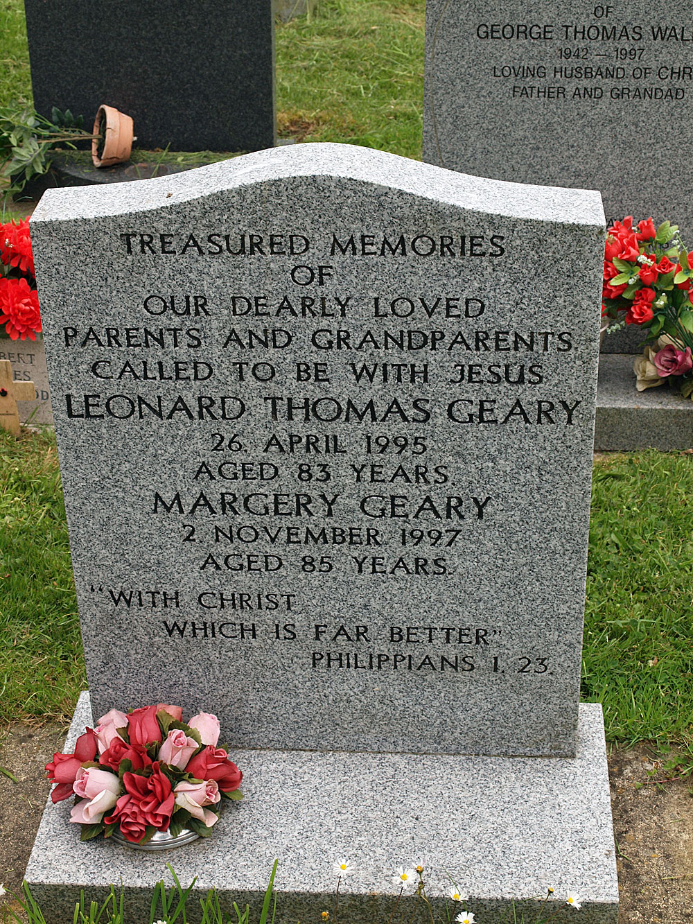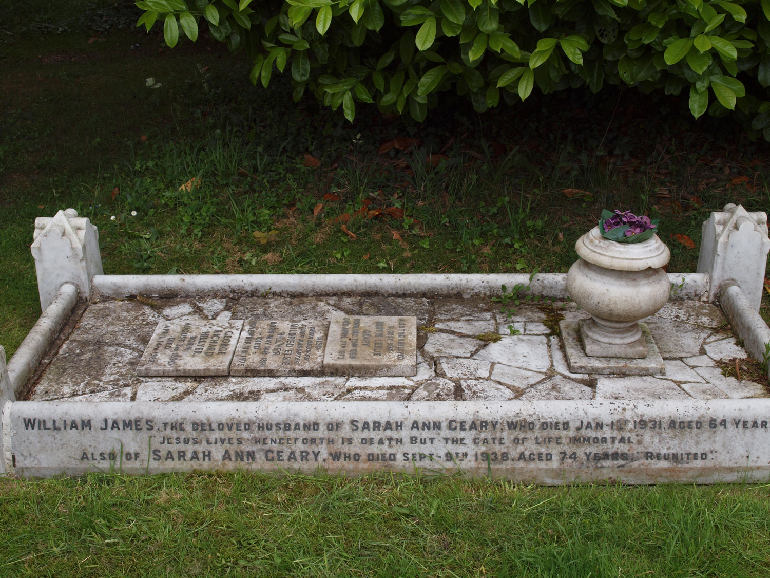 Grave: Headstone: William James beloved husband of Sarah Ann Geary who died Jan 1st 1931 aged - - “Jesus Lives Henceforth Is Death But The Gate Of Life Immortal” Also of Sarah Ann Geary who died Sept 9th 1938 aged 74 years Also their beloved eldest son Bertie Leslie Geary born Dec 23rd 1889 died April 7th 1973 Also their beloved eldest daughter Mildred Elsie Hillyer born May 14th 1891 died November 11th 1975 George Richard Hillyer born August 2nd 1890 died April 14th 1982 Also of our dear son William Wilfred Geary who fell in the great war Oct 12th 1917 aged 25 years “Greater Love Hath No Man Than This”