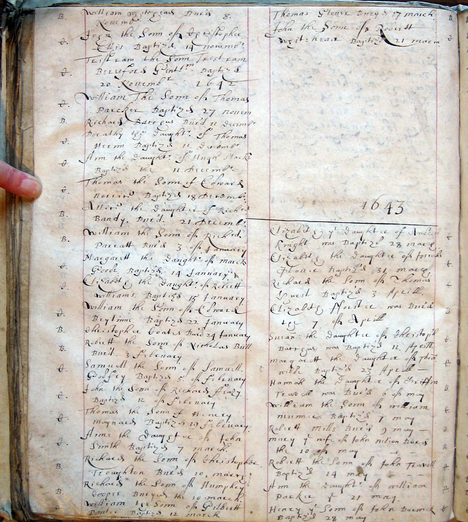 There are 2 columns of information on the original page. The columns are combined above, with the second column running on beneath the first, separated by two horizontal lines. First letter in each row indicates the type of entry: The years above are according to the old style calendar in which the year began on 25 March, Lady Day. The entries above for the period January - March 1642 are for 1643 according to the modern calendar. |