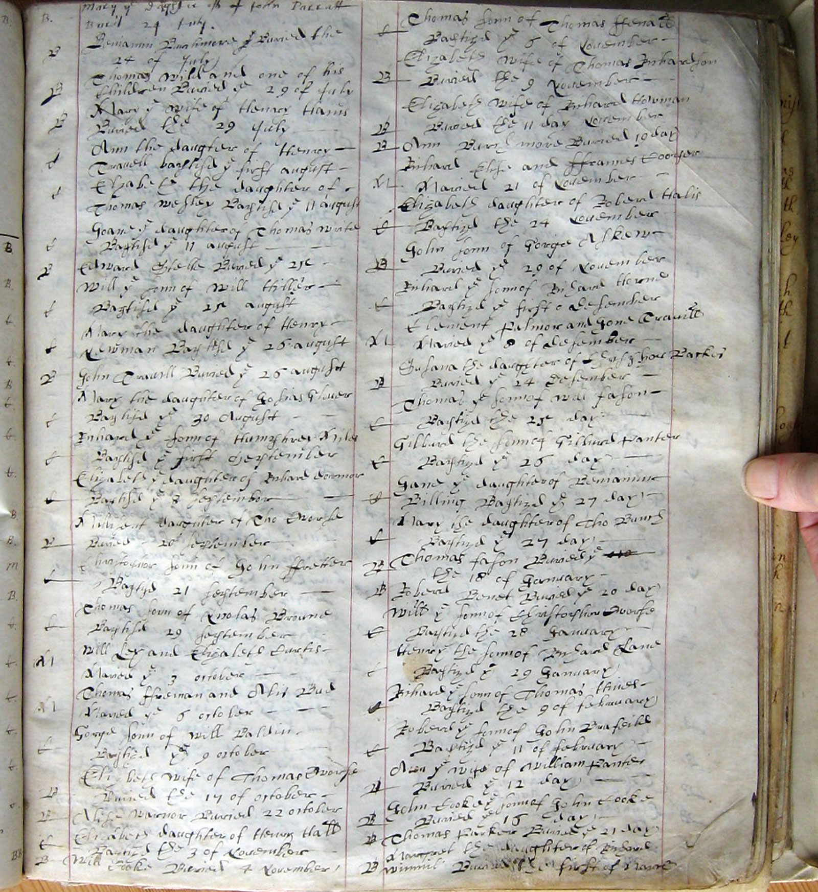 There are 2 columns of information on the original page. The columns are combined above, with the second column running on beneath the first, separated by two horizontal lines. First letter in each row indicates the type of entry: The years above are according to the old style calendar in which the year began on 25 March, Lady Day. The entries above for the period January - March 1644 are for 1645 according to the modern calendar. |