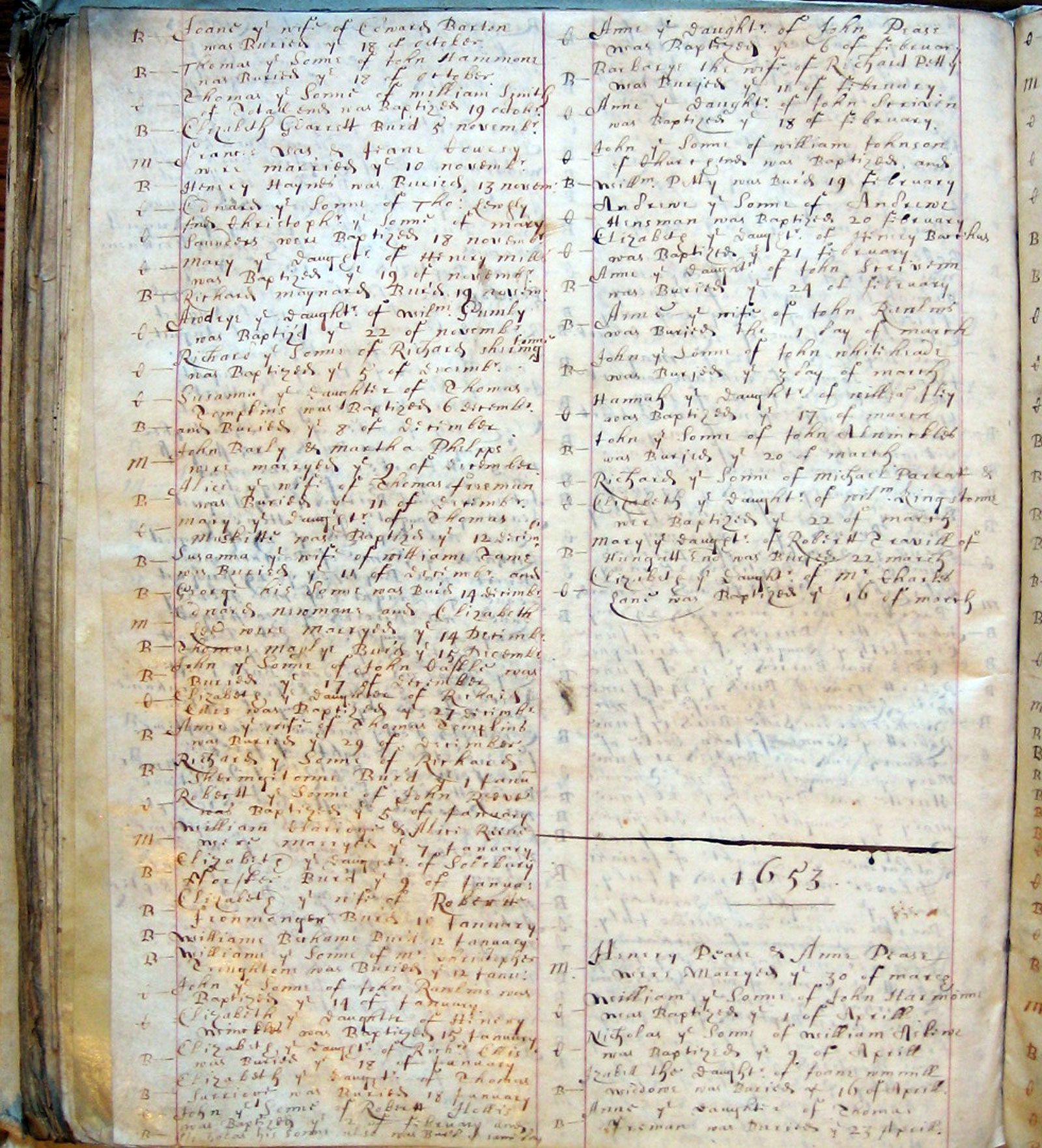 There are 2 columns of information on the original page. The columns are combined above, with the second column running on beneath the first, separated by two horizontal lines. First letter in each row indicates the type of entry: The years above are according to the old style calendar in which the year began on 25 March, Lady Day. The entries above for the period January - March 1652 are for 1653 according to the modern calendar. |