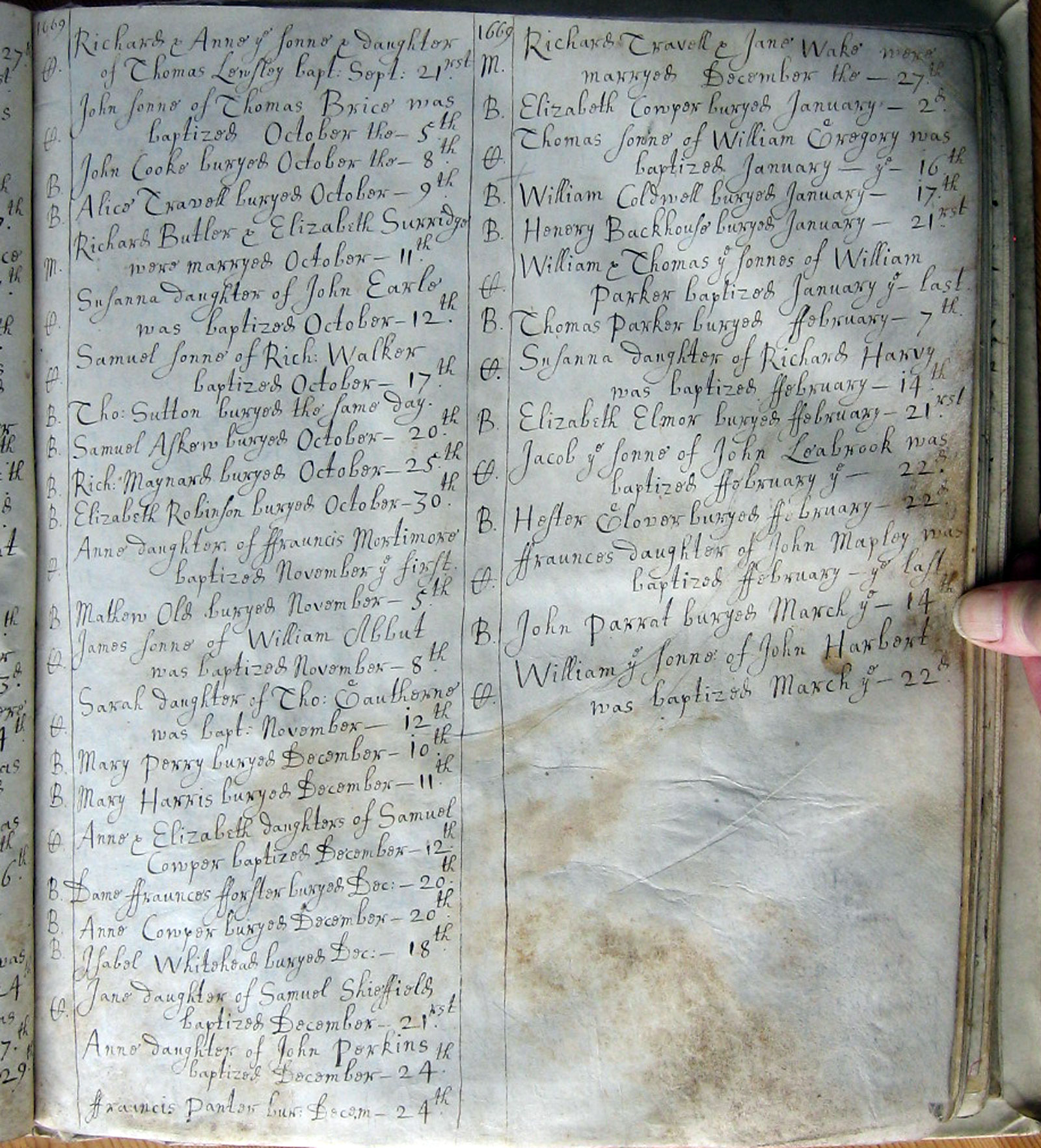 The years above are according to the old style calendar in which the year began on 25 March, Lady Day.  The entries above for the period January - March 1669 are for 1670 according to the modern calendar.