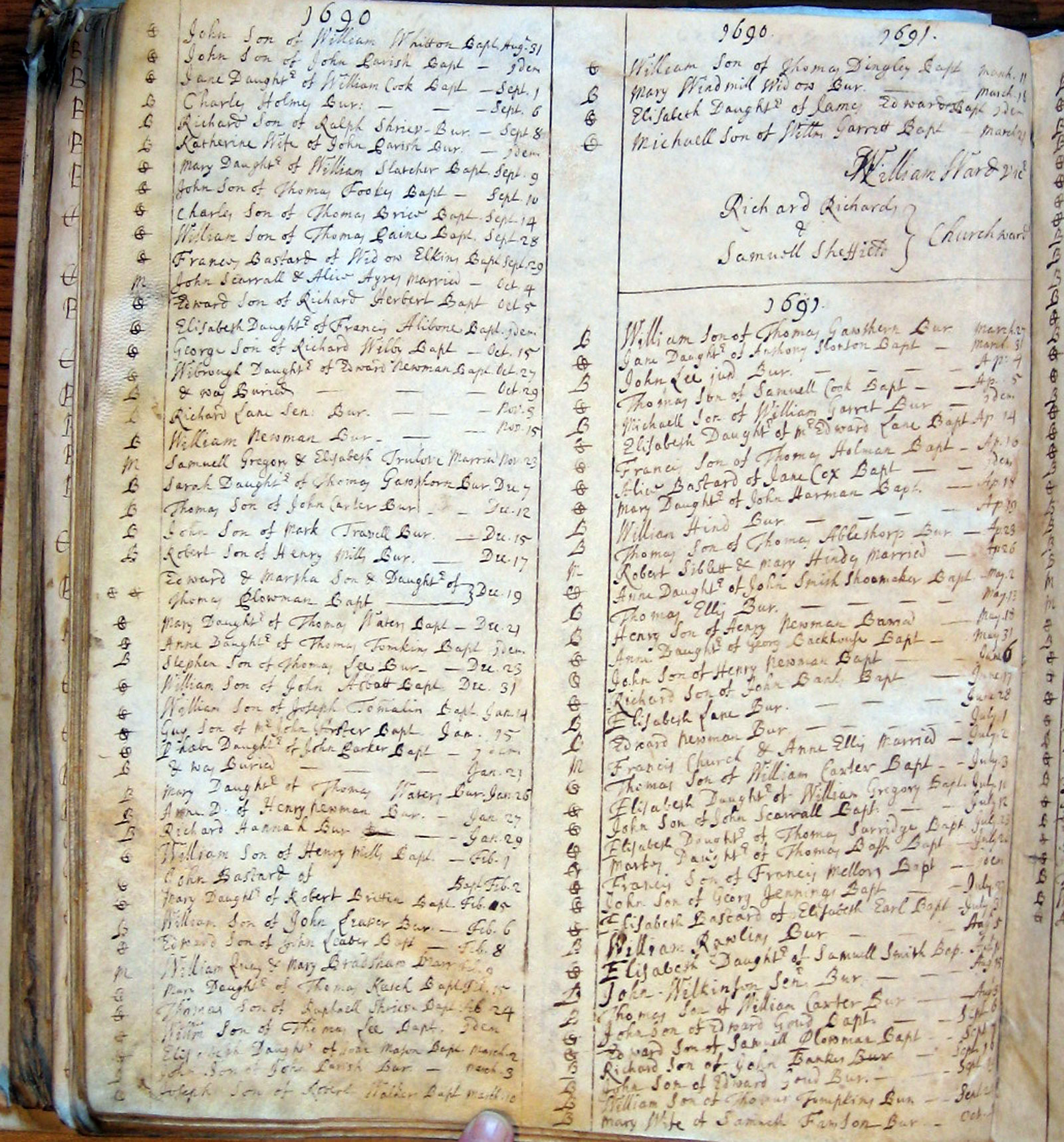 The years above are according to the old style calendar in which the year began on 25 March, Lady Day.  The entries above for the period January - March 1690 are for 1691 according to the modern calendar.