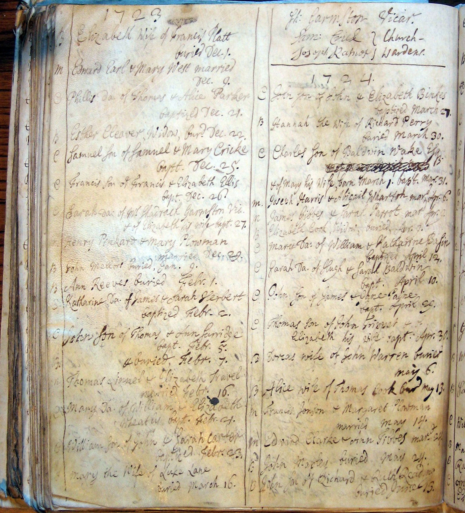 There are 2 columns of information on the original page. The columns are combined above, with the second column running on beneath the first, separated by two horizontal lines. First letter in each row indicates the type of entry: The years above are according to the old style calendar in which the year began on 25 March, Lady Day. The entries above for the period January - March 1723 are for 1724 according to the modern calendar. |