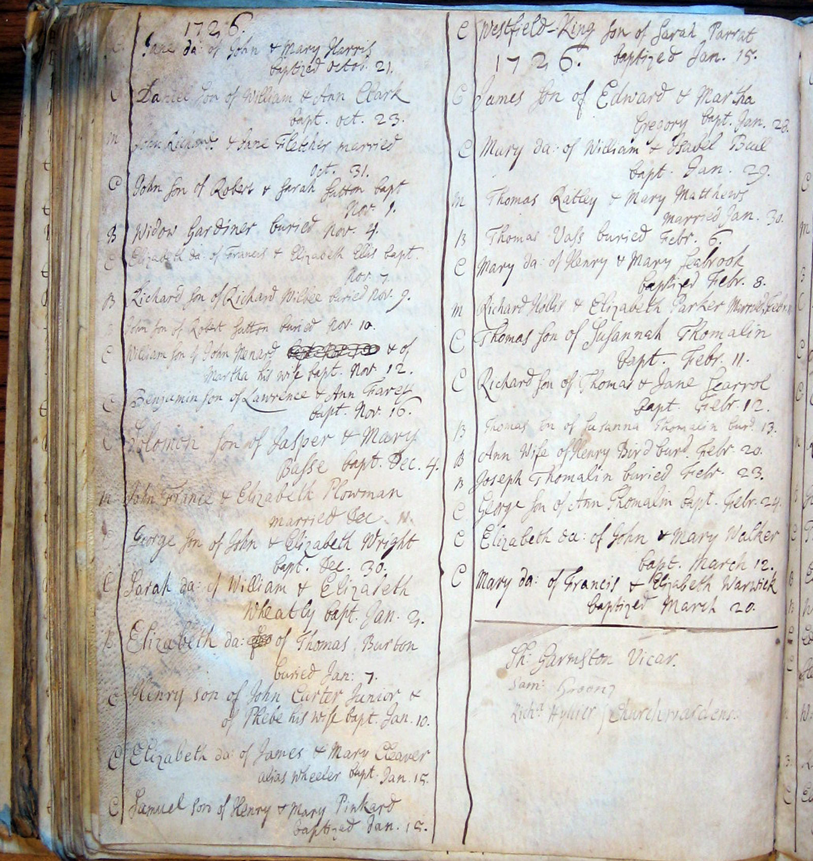 There are 2 columns of information on the original page. The columns are combined above, with the second column running on beneath the first, separated by two horizontal lines. First letter in each row indicates the type of entry: The years above are according to the old style calendar in which the year began on 25 March, Lady Day. The entries above for the period January - March 1726 are for 1727 according to the modern calendar. |