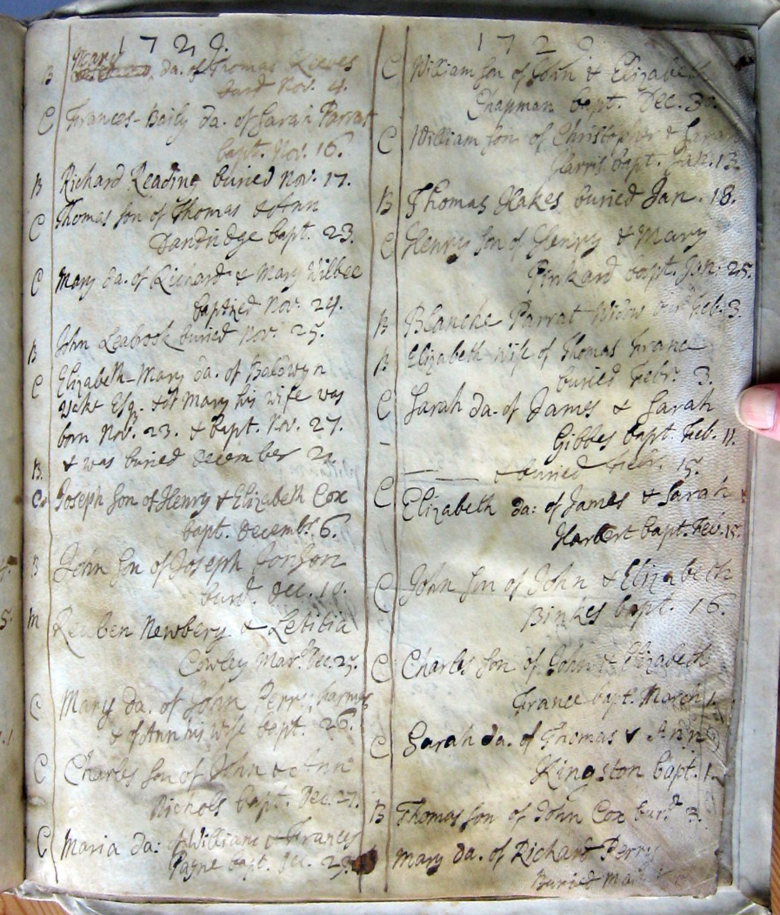 There are 2 columns of information on the original page. The columns are combined above, with the second column running on beneath the first, separated by two horizontal lines. First letter in each row indicates the type of entry: The years above are according to the old style calendar in which the year began on 25 March, Lady Day. The entries above for the period January - March 1729 are for 1730 according to the modern calendar. |