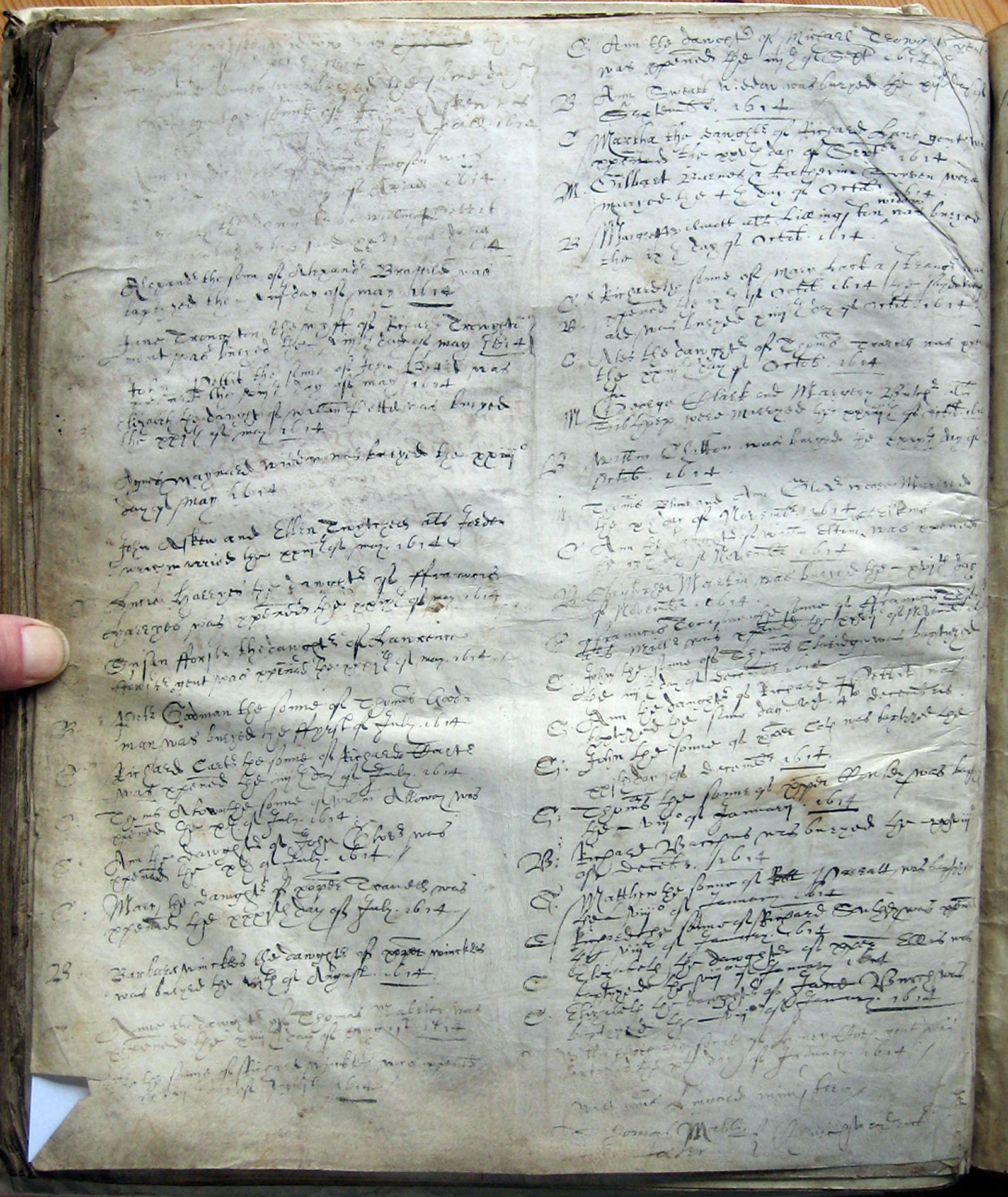 The years above are according to the old style calendar in which the year began on 25 March, Lady Day.  The entries above for the period January - March 1614 are for 1615 according to the modern calendar.