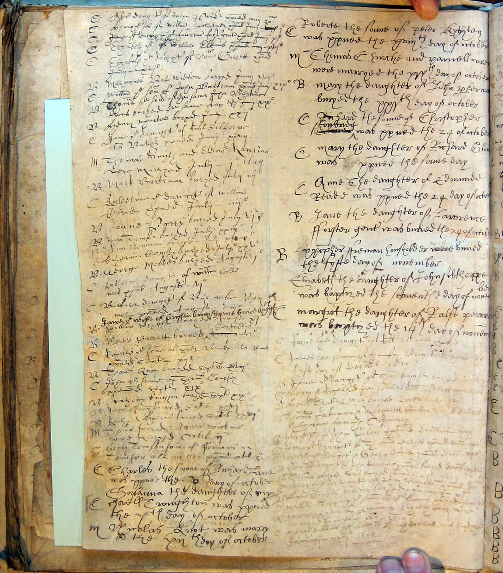 There are 2 columns of information on the original page. The columns are combined above, with the second column running on beneath the first, separated by two horizontal lines. First letter in each row indicates the type of entry: The years above are according to the old style calendar in which the year began on 25 March, Lady Day. The entries above for the period January - March 1619 are for 1620 according to the modern calendar. |