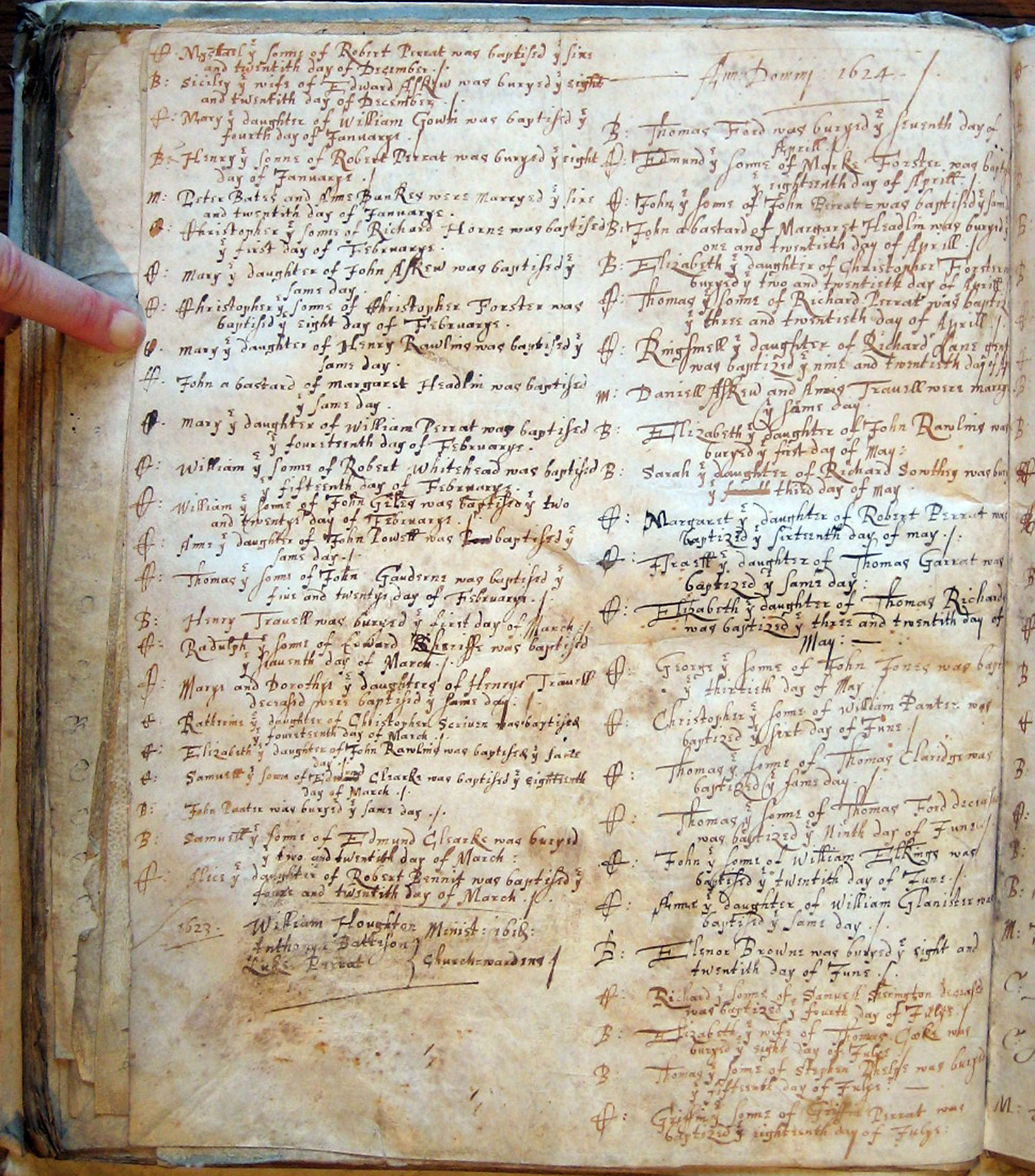 There are 2 columns of information on the original page. The columns are combined above, with the second column running on beneath the first, separated by two horizontal lines. First letter in each row indicates the type of entry: The years above are according to the old style calendar in which the year began on 25 March, Lady Day. The entries above for the period January - March 1623 are for 1624 according to the modern calendar. |
