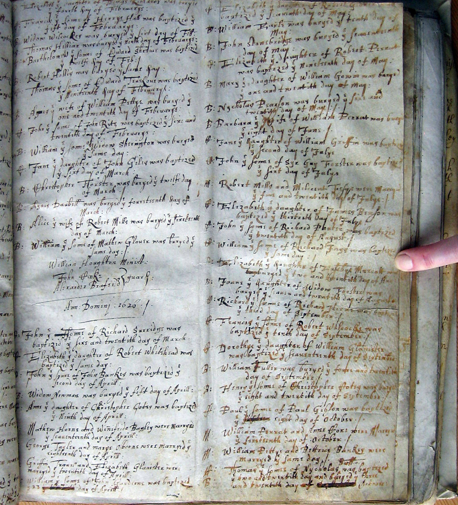 There are 2 columns of information on the original page. The columns are combined above, with the second column running on beneath the first, separated by two horizontal lines. First letter in each row indicates the type of entry: The years above are according to the old style calendar in which the year began on 25 March, Lady Day. The entries above for the period January - March 1625 are for 1626 according to the modern calendar. |