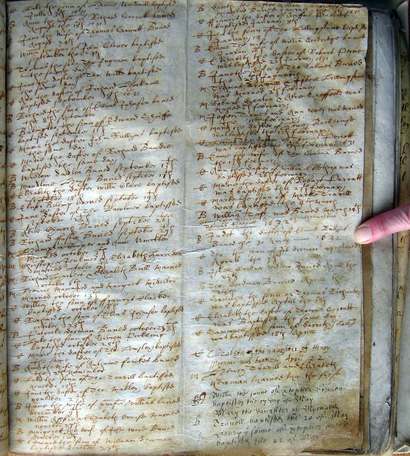 There are 2 columns of information on the original page. The columns are combined above, with the second column running on beneath the first, separated by two horizontal lines. First letter in each row indicates the type of entry: The years above are according to the old style calendar in which the year began on 25 March, Lady Day. The entries above for the period January - March 1631 are for 1632 according to the modern calendar. |
