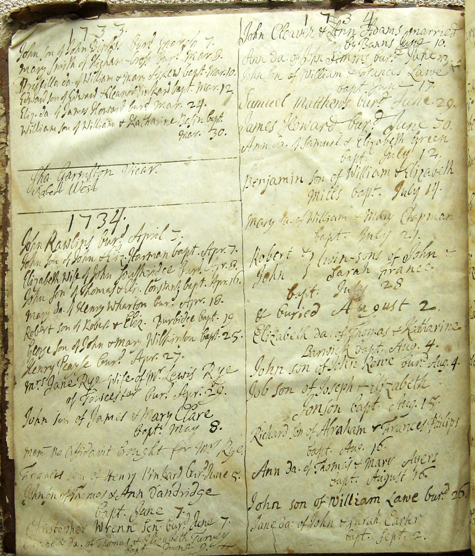 There are 2 columns of information on the original page. The columns are combined above, with the second column running on beneath the first, separated by two horizontal lines. The years above are according to the old style calendar in which the year began on 25 March, Lady Day. The entries above for the period January - March 1732 are for 1733 according to the modern calendar. |